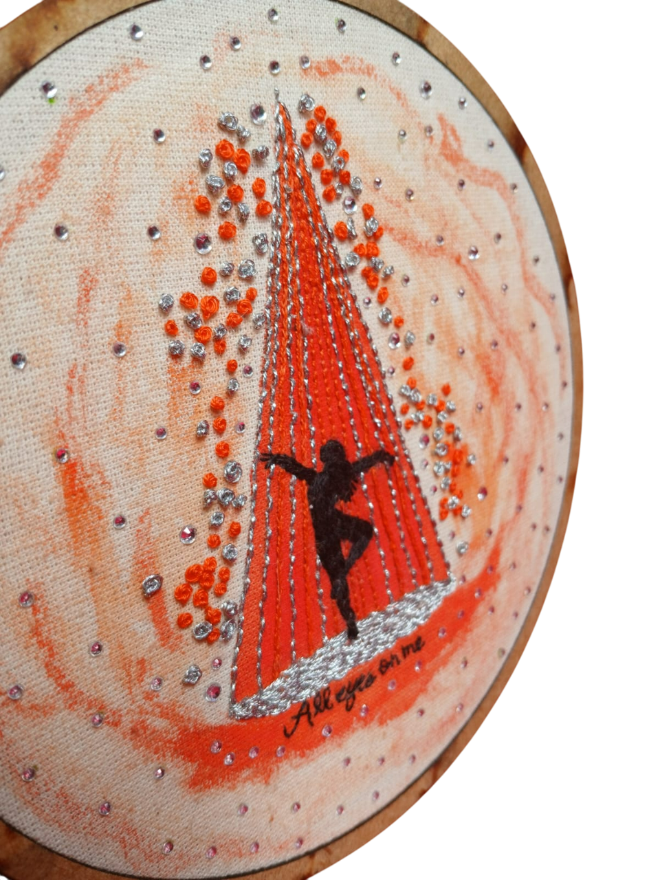 Each piece is entirely handmade, combining embroidery and embellishments to create expressive textile artworks.